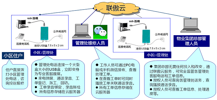 受理住户或业主来电,咨询投诉报修工单管理管理,来电弹屏,通话录音,电脑和微信派单,短信通知。总部随时查阅工单处理情况,调听各小区客服通话录音,管理无死角。SAAS模式,即租即用。