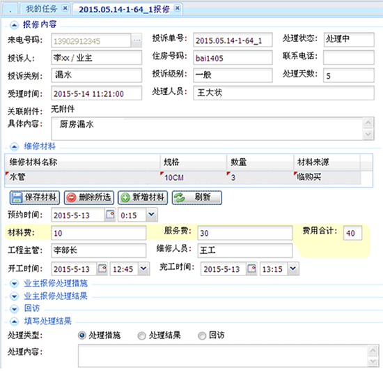 报修类工单处理:记录维修材料明细和服务收费清单。