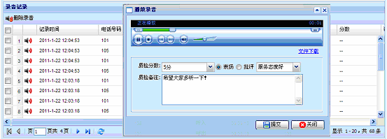 质检人员可对通话录音进行质检,对话务员服务进行评价。