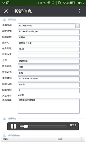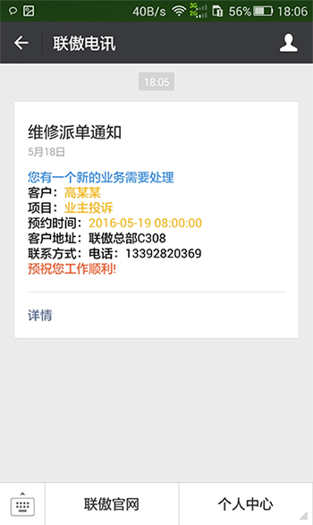 工单可同步派送到接收人的电脑和手机微信上,维修人员可随时通过手机微信接收维修工单通知,查看工单详情记录,回放通话录音,在客户现场在手机微信上登记工单处理内容。