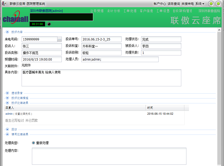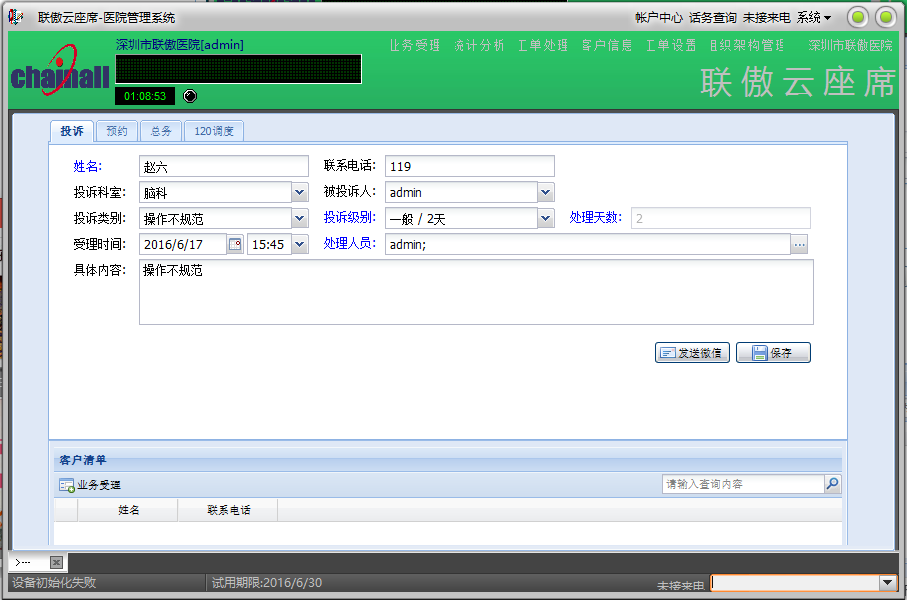 受理病患,病患家属和内部人员来电。病患和病患家属投诉,预约医生,以及呼叫120救护车,内部人员致电客服中心报修。投诉预约报修工单管理,来电弹屏,通话录音,电脑和微信派单,短信通知。SAAS模式,即租即用。