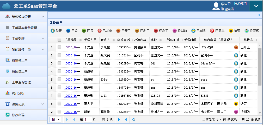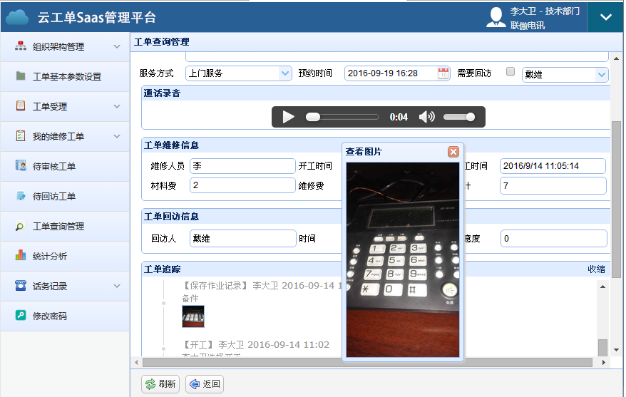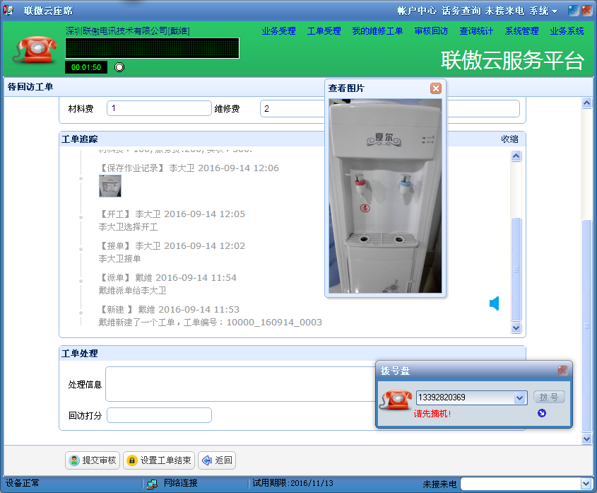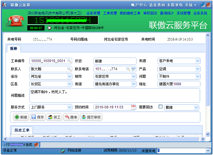 为企业提供客服电话管理、业务受理、微信派单、抢单接单、短信通知、来电弹屏、通话录音、点击呼叫、工单处理登记、拍照上传、在线支付、工单跟踪管理、统计分析等全方位解决方案。