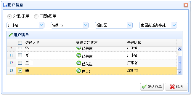 电话受理工单、网络受理工单等。根据服务内容和地点进行派单。同时在电脑和微信上收到工单通知, 可同时向多人派单,支持抢单模式。