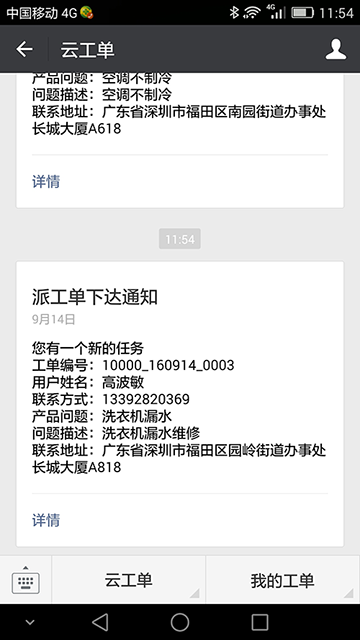 工单受理、工单接单等重要环节系统自动向客户手机发送一条通知短信。