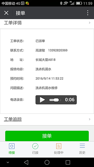 派单对象立即在微信上收到通知,可查看工单详情。回放客户电话下单的通话录音,准确了解业务细节。点接单按钮一键抢单,支持向多人派单,先接先抢。