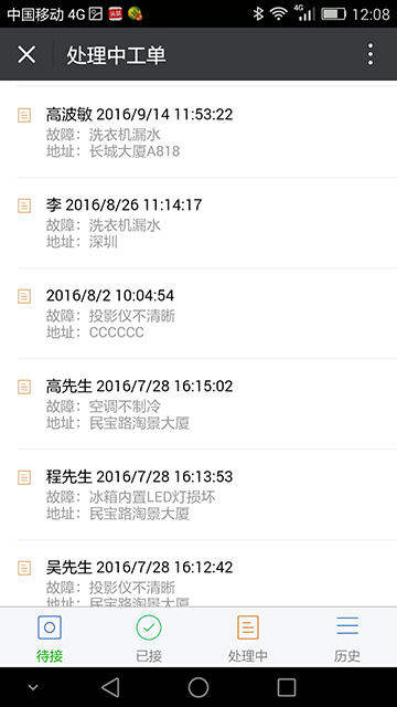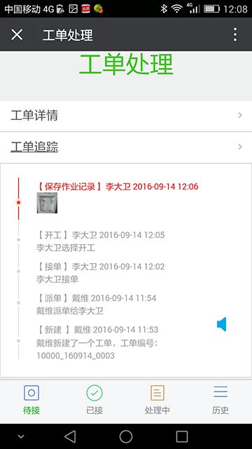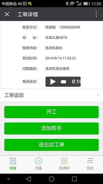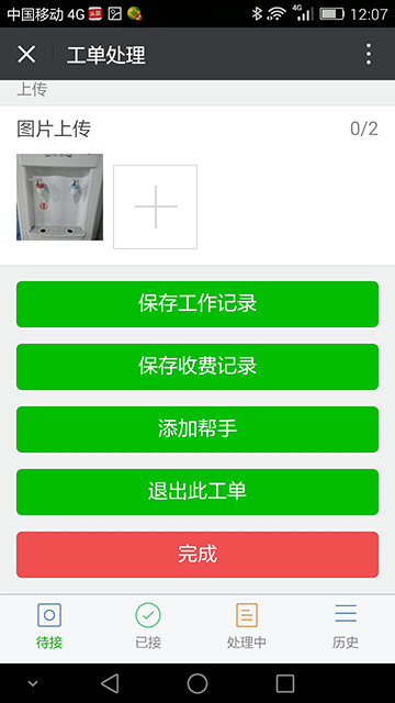 外勤人员可直接在微信上查看处理工单,支持接单、开工、邀请帮手、完工、拍照、收费、填写处理记录等。