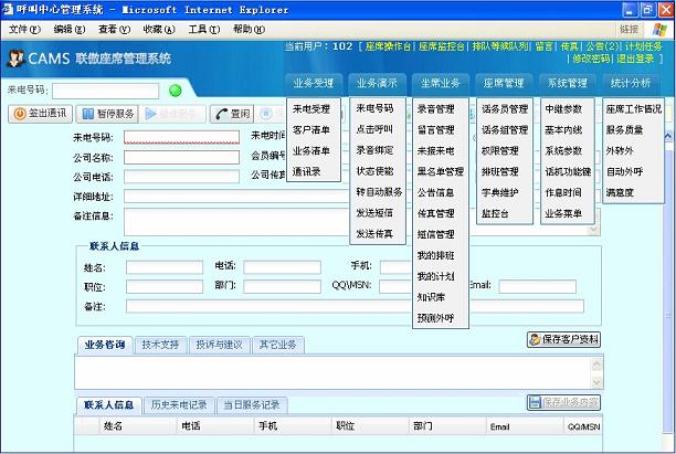 - 联傲座席管理系统(CAMS)是在iCall座席上实现的B/S框架,全面整合了系统管理、座席通讯、系统监控、传真收发、短信与邮件收发、统计分析、辅助工具等功能。