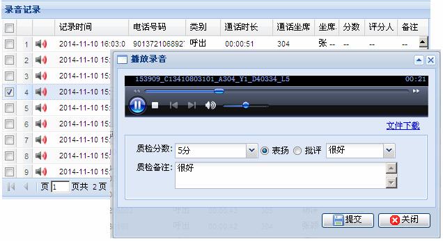 - 录音质检:质检人员可对话务员的通话录音进行相应的评分及评价,质检结果可生成统计报表,方便通过录音案例对服务人员进行针对性的培训、案例分析、业务核实等。