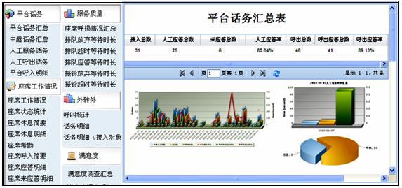 - 系统平台汇总报表、中继线路话务汇总报表、呼入/呼出报表、未接来电报表、座席通话明细报表、座席工作情况报表、座席考勤报表、座席服务质量报表、服务满意度报表等等。