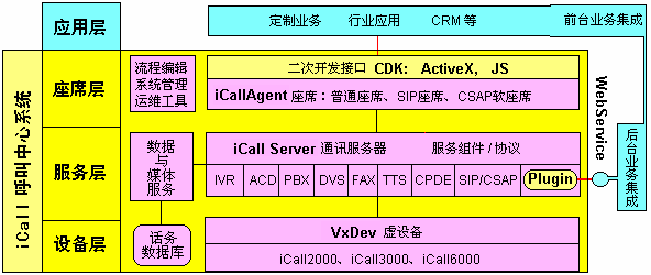 包括设备层、服务层、座席层。iCall呼叫中心系统平台进行了完整的产品化封装,提供完备的系统运维管理工具。