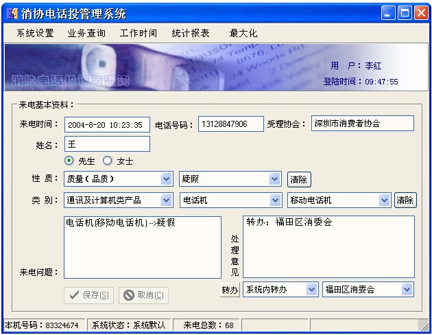 来电投诉受理登记界面:话务员接听来电时候自动生成一个新的投诉纪录,并且将来电号码、时间、工作人员信息等自动填写到纪录中,