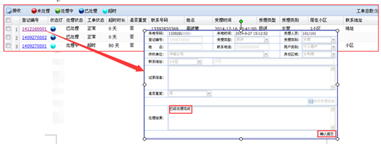 - 在实施处理结束后记录工单处理结果,确认后提交。受理该工单客服即可收到工单处理结果,便于回访用户或在用户来电咨询处理结果时进行答复;