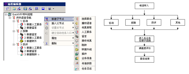 - 提供面向终端用户的流程编辑器,用户无需专业知识,就可方便快速自行定制呼叫流程(IVR),以满足业务变化和发展的需要,做到一次购买,永久适用。