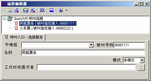 利用iCall的流程编辑器,建立2个流程入口,在“被叫号码”栏目分别填写88881111、88882222分别对应飞机票、火车票的服务流程。这样客户拨打88881111自动进入“民航票务”对应的流程入口,拨打88882222则自动进入“火车票”对应的流程入口。