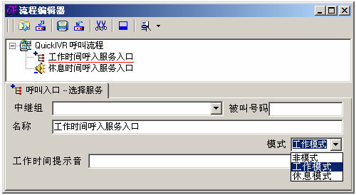 iCall可设置工作和休息模式流程,当客户来电时系统自动判断,如果是工作时间则走工作流程,如果是休息时间则走休息流程。 打开流程编辑器QFEdit,流程入口节点有一个参数“模式”控制流程的时间属性。