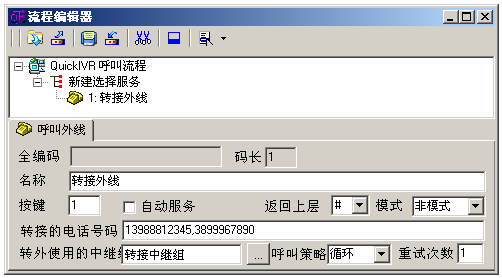 在需要转接手机的地方创建一个“转接外线”节点,配置好转接号码、转接使用的中继线路等,可同时配置多个转接号码。流程运行到此会自动转呼外线号码。并且转接通话也有录音,有详细的分类话单,可根据时间号码等查询转接记录、播放转接通话录音。
